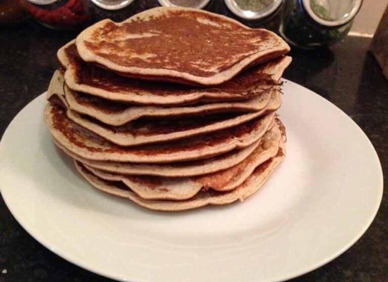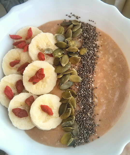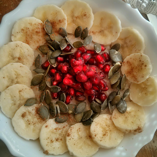 Enquanto bebo o batido vou preparando o pequeno almoço. Normalmente alterno entre uma panqueca de aveia ou polvilho doce e papas de aveia. Sempre a acompanhar com fruta, sementes e muita canela.