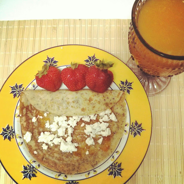 | Panqueca de aveia, leite de amêndoas, frutos vermelhos, requeijão e canela |